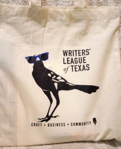 I was in one of my favorite Texas cities recently (one of my favorites other than Houston, of course). The Writer’s League of Texas held their annual Agents & Editors Conference in Austin. Here is the handy cloth bag everyone was given during registration. Not sure where the idea for the bird came from, but we also received a nice pair of blue sunglasses in our welcome packet. This was my first state-wide writer’s conference. It was everything I had hoped for and more.
