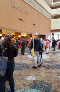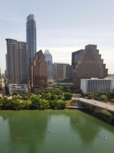 The location for this event was the Hyatt Regency that overlooks Lady Bird Lake. Service was good, food was good, beds were comfy, and everything was in one place. Since this took place in June, you were never required to leave the hotel with the fully functioning air conditioning system. However, there was a hike and bike trail right outside the hotel and we were within a block of the Congress Street Bridge where one could view bats flying on a nightly basis. In between conference sessions I could watch as the kayaks and canoes floated down the river. This particular view was taken from the 17th floor outside of areas where the meetings took place with a large group of agents and editors. More about that later.