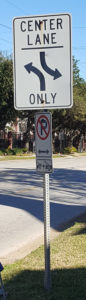 In the Center Lane example, it appears as though that is the lane you want to be in to turn sharply to avoid a head-on collision. Apparently, this is a confusing sign, because very few people use the center lane as a turn lane and hold up traffic when they turn from the outer lanes. I find this quite annoying. The example with the squiggly arrow is alerting to me that the path ahead is not straight. Kinda a philosophical viewpoint for life, don’t you think?