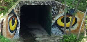 Last week we experienced some terrific weather here in Houston. What one would typically call, “Chamber of Commerce Weather”. Temperatures were cool. The sun was shining. Where else to go, but to the Houston Arboretum. There has been a lot of nature development at the Arboretum. There are new trails and many of trails that I have walked for years have been resurfaced and improved. I love it there when it is cool and sunny. Imagine my surprise when I found this while walking on the Ravine trail. A pair of Owl eyes daring me to get too close. I can only imagine that someone affiliated with Rice University painted this beautiful scenery.