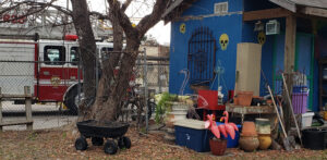 For instance, there is this nice blue building painted with skulls and surrounded by pink flamingos. I do not know the purpose of the building, but it looks really neat considering it is across the fence from the City of Houston Fire Department Maintenance Depot. There are random pieces of art scattered about in between different small gardens.