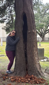 What else is there to do on a cloudy, windy, cold day in February? When everyone else is thinking about hearts and valentines, my thoughts turn to touring local cemeteries. The older the better, and Houston has some really old ones. Fortunately for me, I am not the only one who enjoys a visit with the dearly departed. My WiVLA sister (That’s the Women in the Visual and Literary Arts for those of you not in the know) and friend, Sabina Gartler is also interested in perambulating amongst the tombstones. This particular picture of Sabina was taken at Founders Memorial Park in downtown Houston. Neither one of us could figure out what was going on with this tree. It was as if it was being eaten from the inside out. Or maybe this is where the local ghosts go inside when it is cold outside. Who’s to say? I don’t judge.