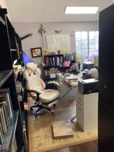 However, I’ve installed some bookcases, and the closing off of the door allowed me to use that space for my curio cabinets. By shifting these out of the office space, the possibility of a new arrangement of the workspace loomed. And so, the first week of 2022 began with the rearrangement of furniture and the organization, finally after two years, of the books on the bookcases.
