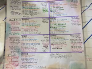 Now, you have the spaces where time is yours to allot. This is where you plug in the sessions of things you really want to do. Once you have that on your paper, you can put it cleanly together on a big page so it is all available at a glance. So, here’s what the final itinerary looks like for me.