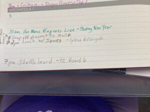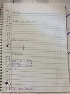 So you itemize your itinerary layout by first plugging in for the week the items that are absolutely set in stone. These hours are not going to change and there’s no other use you can make of them. Here’s a picture of what that looks like for me. Note that the teaching sessions as well as my podcast session are set plus my critique groups and shuffleboard times. These don’t change. So they go in first.