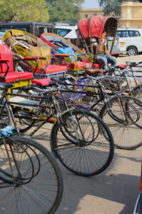 You need a car and driver for longer distances. But for efficiency, you can’t beat the tuk-tuks. They’re designed for a driver and two, maybe three, passengers, and seem to be the favored transport of sari-wrapped women and small families. Tuk-tuks range from decrepit to possibly having been built in the current decade. They, too, are painted with the ubiquitous “Blown Horn” edict. They have mileage meters. Ignore them, they aren’t relevant. Fares are negotiable. Settle the price before stepping inside. I usually ask someone what the fare should be, then count on paying up to double that amount. The rides are cheap, I’m a Westerner and I don’t speak Hindi—the extra rupees are a tourist’s premium.