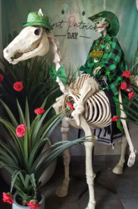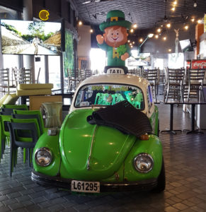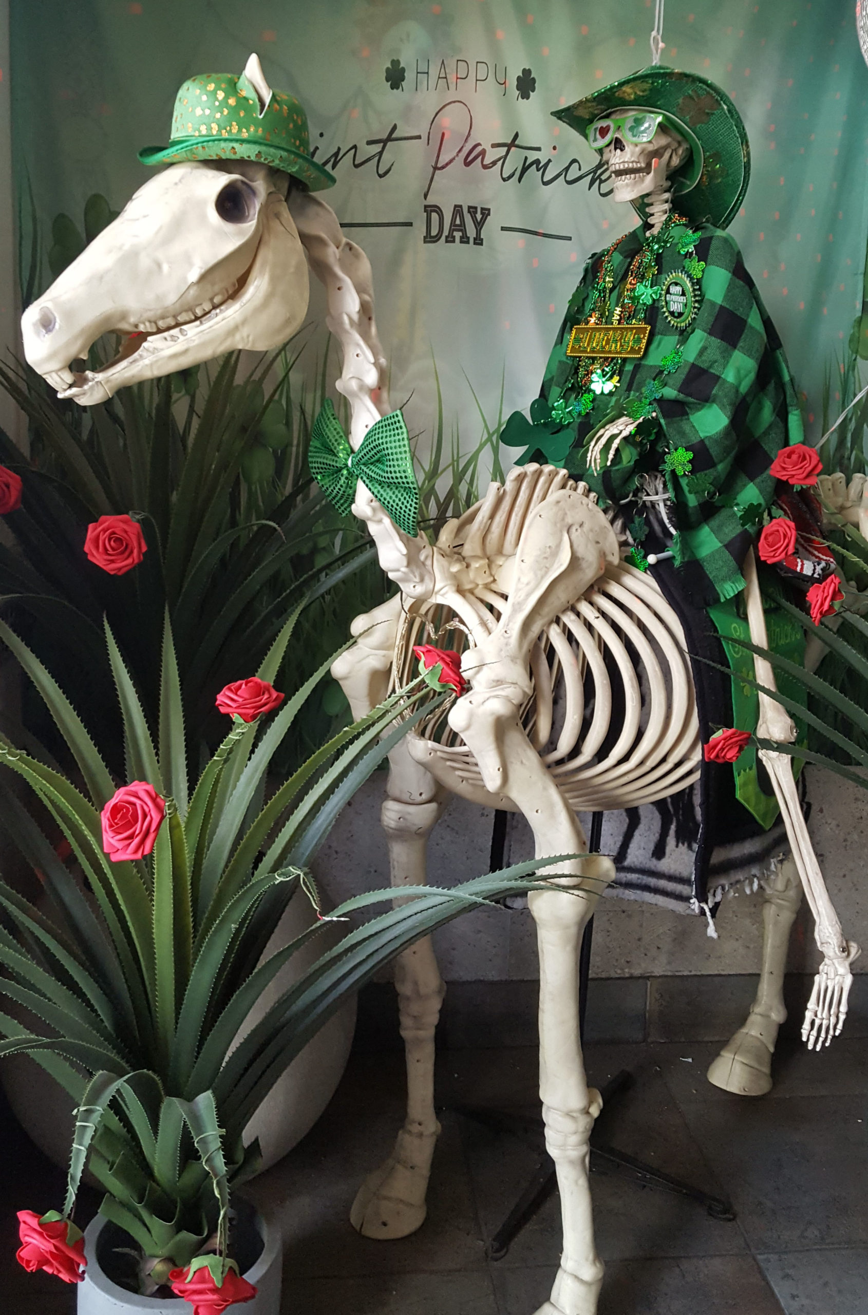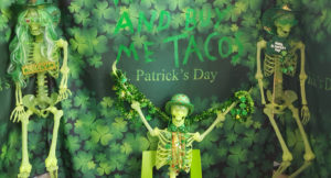 You may remember that I wrote about 100% Taquitos as my go to restaurant for El Dia De Los Muertos (Day of the Dead). Now they are my new favorite restaurant for St. Patrick’s Day. As you can see the taxi with the leprechaun on top and skeletons inside is surrounded by tables that have been stacked up so no one coming in for take out will be able to sit down. On top of the front of the taxi are two floor mats as further evidence of the seating area not being open. Also, all employees who prepared the food wore gloves. Again, I ordered food that required cooking.