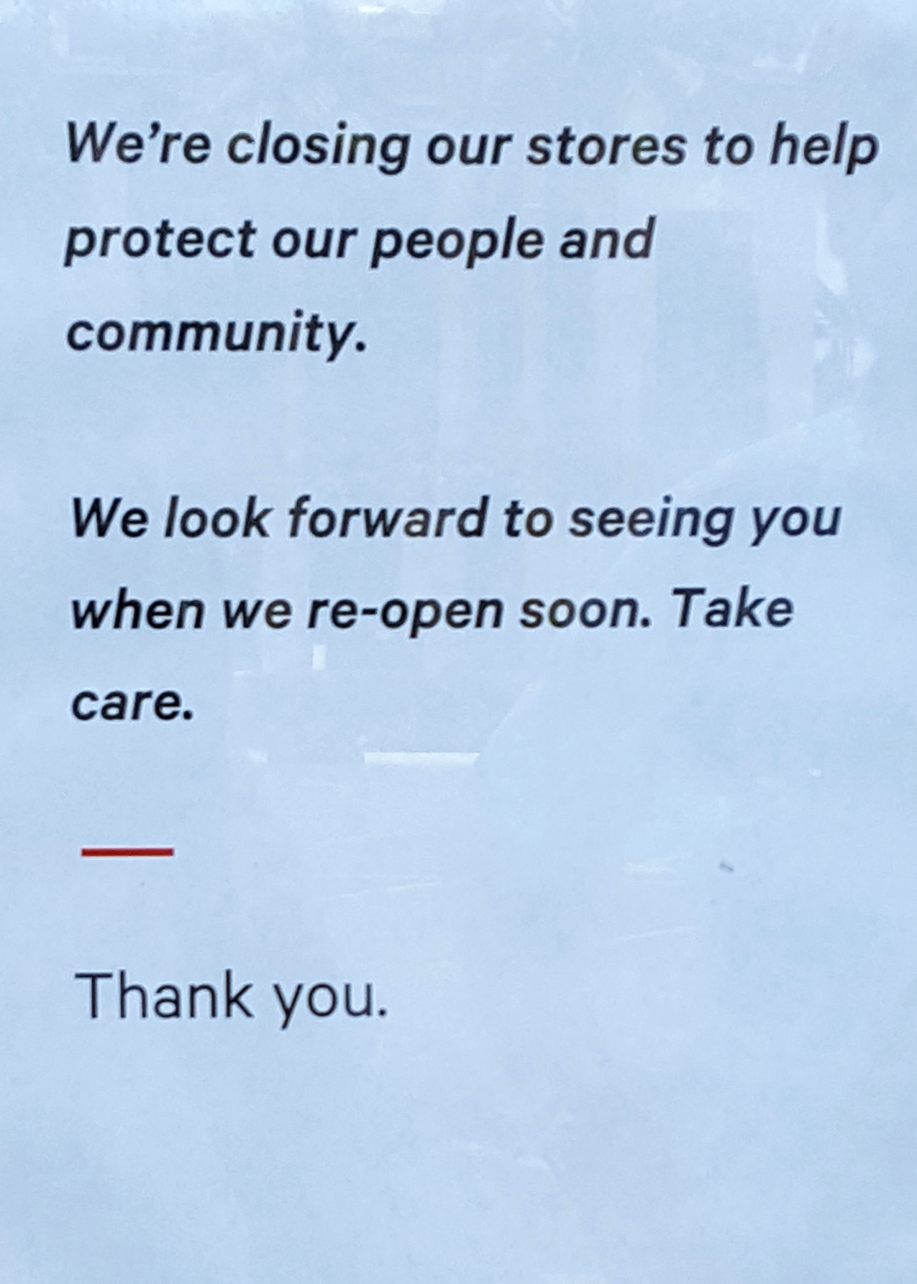 Last week I wrote about going out to eat at a restaurant where all patrons were spaced out, food was cooked. Wasn’t that nice? I really enjoyed it. Today as I walk around the neighborhood, I see many signs like this one. Many shops are closed. The gym that I like to attend is closed. Movie theaters are closed. The Houston Theatre District has ground to a halt.