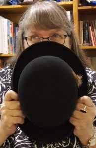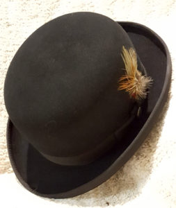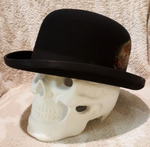 Bowler hats are not traditional headgear for the “every woman”. When a woman wears a bowler hat, is she picking up on a surrealist life style? Looking for meaning in the unconscious? Gleaming insight and inspiration from the area between waking and sleeping? Can you find writing prompts inside a bowler? A male character in a mystery novel who wears a bowler hat is a hidebound traditionalist. Yet, a woman in the same novel wearing a bowler hat is a bit quirky and unusual.
