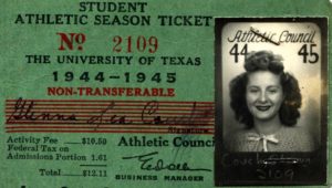 Mears Studio hired her to model. In those pre-ballpoint pen days, UT students received these 3.5 x 5 inch “ink blotters” to use while taking class notes. Also, the studio enlarged this pose and plastered it on the side of their downtown building.