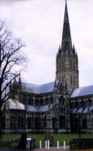 The tallest church spire in the United Kingdom lured us to Salisbury Cathedral, outside London. Mother stopped outside to read the outside plaques., Spot the tiny, huddled figure in the lower left here?